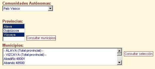 El programa permite desplegar una lista, primero, con las comunidades y, una vez seleccionada una de ellas, las provincias pertenecientes a esa comunidad. Después de marcar la provincia o provincias que se desea consultar y pulsando el recuadro correspondiente se desplegarán por orden alfabético todos los municipios de esas provincias y el total provincial para que puedan seleccionarse los que interese. Una vez marcados, no habrá más que pinchar el botón